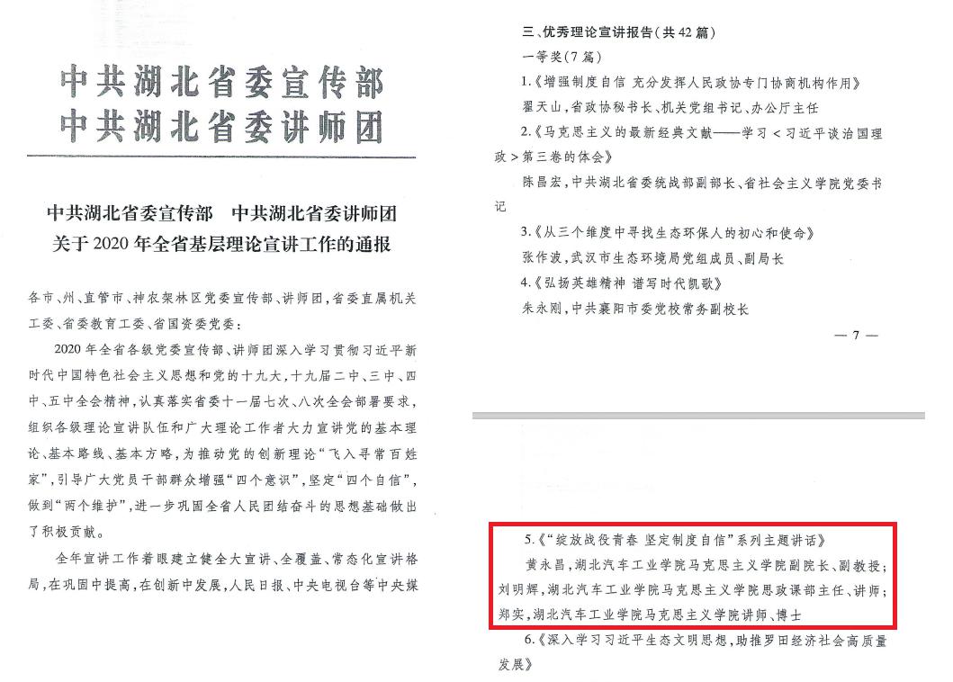 本网讯(文、图/刘明辉、马保青)近日,中共湖北省委宣传部、省委讲师团联合下文,表彰一批2020年优秀基层理论宣讲集体、个人和优秀宣讲报告。由我校马克思主义学院与校党委宣传部联合申报的“绽放战疫青春·坚定制度自信”系列主题思政报告获得优秀理论宣讲报告一等奖,全省只有七项获得一等奖。