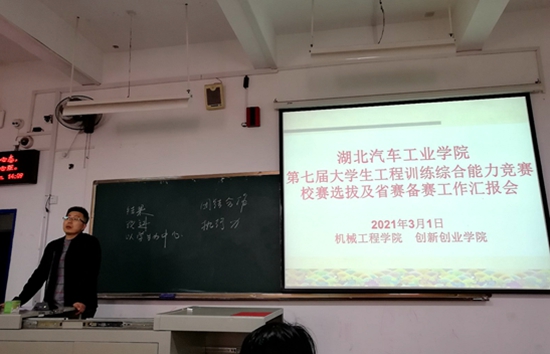 本网讯(文/图 齐剑平)3月1日下午,学校在第六教学楼6202教室召开第七届大学生工程训练综合能力竞赛校赛选拔及省赛备赛工作汇报会。会议由机械工程学院副院长陈君宝主持,创新创业教育学院院长缪勇、办公室主任王欣,各竞赛项目指导老师以及全体参赛学生参加汇报会。